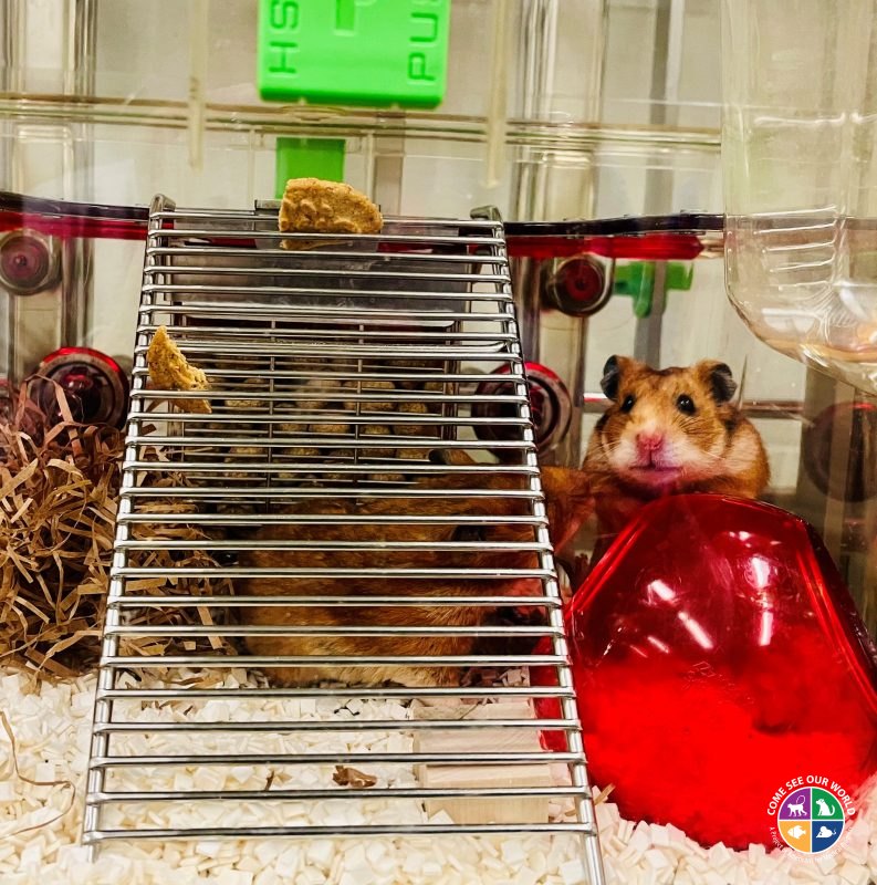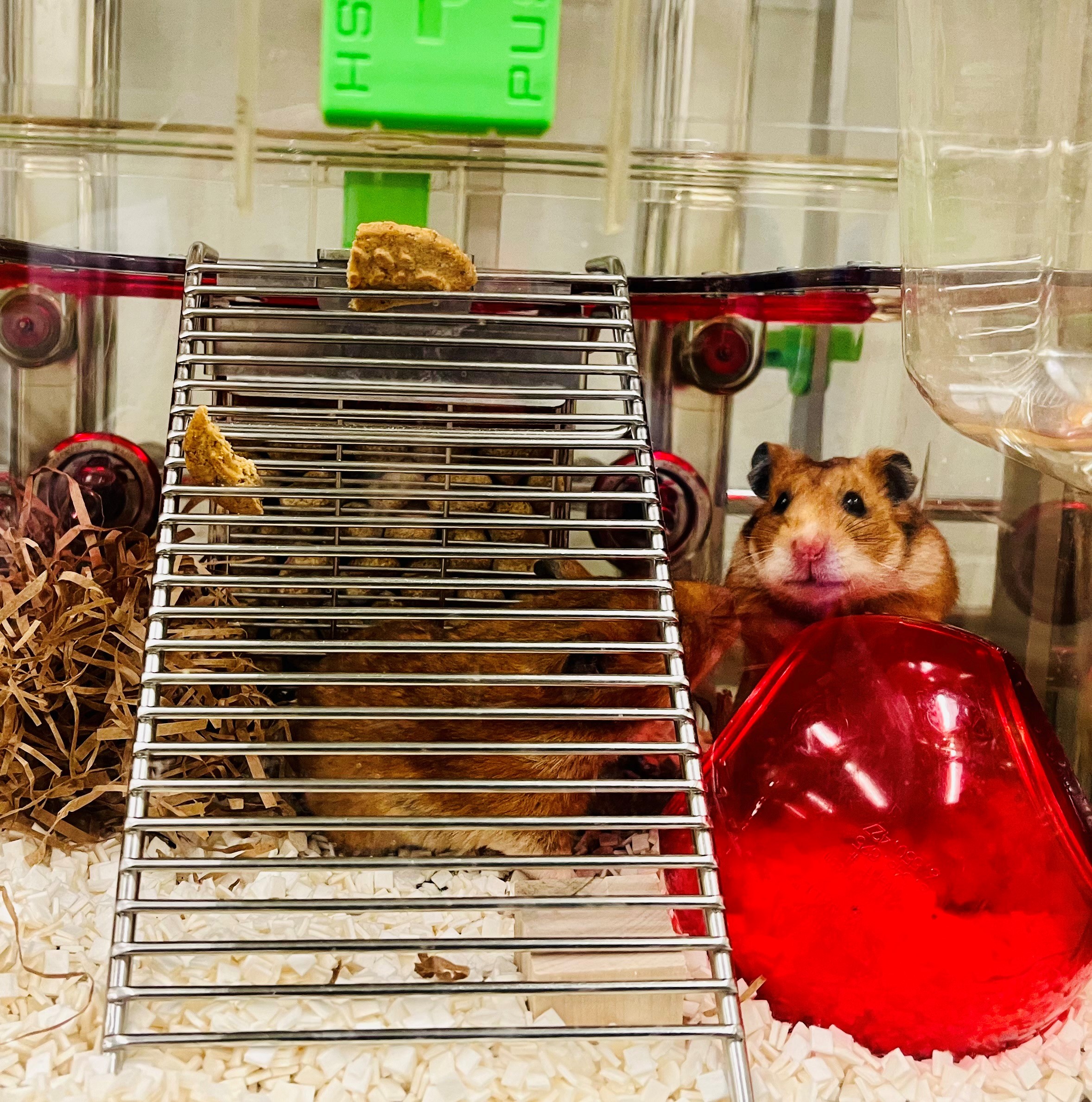 Hamsters participating in vaccine safety studies now benefit from double decker housing originally created for rats. After some training, they climb ladders and explore multiple levels, staying active and engaged. Their housing also makes it easier for caregivers to interact with them through the wide opening. These hamsters receive new vaccines to help scientists understand the medicine's efficacy and potential side effects before it moves on to clinical trias with human volunteers.